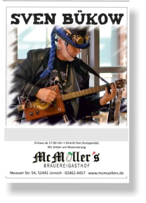 CigarBoxGuitar Blues liveSven BükowMit traditionellem, urtypischen und zeitlosen Blues verzaubert Sven Bükow sein Publikum mit Sounds & Lyrik’s. Ergänzt mit Zigarrenkistengitarren, Mudharmonikas, Querflöte, Tenorsaxophon, Elektropercussions und Loops werden bekannte und eigene Songs vorgeführt und dargestellt.Termine in 2025 >>> hier zu den aktuellen Terminen auf der Webseite von Svenneu Termine in 2026Rehaklink KorschenbroichFreitag, den 24.01.2025 04.04.202530.05.202504.07.202521.11.2025Unter der Woche um 19 Uhr McMüllers 15.11.2025 -19.30hMauritius Therapieklinik Meerbusch09.02.202527.04.202506.07.202521.09.202516.11. 2025und neu 26.12.2025um 15 UhrHotel Lüttelforster Mühle in Schwalmtal22.06.2025 um 16 Uhr zurück…